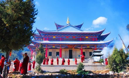 普濟(jì)寺位于麗江古城西北6千米的普濟(jì)山中,始建于清乾隆三十六年(1771年),為麗江城郊五大喇嘛寺之一,因大殿鋪蓋銅瓦面而聞名遐邇。大殿院落由山門(mén)、護(hù)法堂(門(mén)樓)、正殿、南北廂房組成四合院。正殿平面是長(zhǎng)方形,初用土瓦覆蓋,由圣露活佛輾轉(zhuǎn)西南各地講經(jīng)、集資,于1936年改覆銅瓦,面積為46.4平方米。