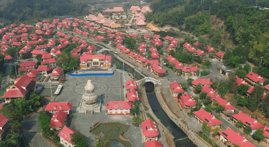 葫蘆小鎮(zhèn)位于滄源縣城西南3千米處,于2013年建設(shè)完工,小鎮(zhèn)占地面積202畝,共有民居180戶,建筑風(fēng)格保留佤族民居獨(dú)有的建筑特點(diǎn),外形特征為紅色弧形屋頂及屋角裝飾交叉角。小鎮(zhèn)180棟紅色弧形屋頂特色民居與文化墻、噴水葫蘆、打歌廣場、寨心磚、葫蘆塔、佤王府等佤族特色建筑巧妙地融合在一起。