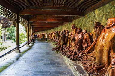 以根雕藝術(shù)展現(xiàn)佛教文化的圣地,是由千年樹神匯聚的藝術(shù)殿堂,建筑面積1.2萬平方米,縱深有三座大殿,第一幢為雙層結(jié)構(gòu),第二第三幢均為單層結(jié)構(gòu)。兩邊另有羅漢文化長廊依山而建,環(huán)繞其間,有未來佛殿、大雄寶殿、羅漢堂等,陳列有釋迦牟尼、未來佛、四大菩薩、四大天王、五百羅漢等佛教文化系列巨型根雕作品一千余件,其中最大的根雕釋迦牟尼主佛,形體龐大,重達40余噸,根材花巨資,于中緬邊境一路繞道跋涉而來,經(jīng)醉根“點化”,巍然成佛!五百羅漢陣更是氣勢雄偉,長達680余米,整體布局渾厚古雅,堪稱中華一絕、世界之最。