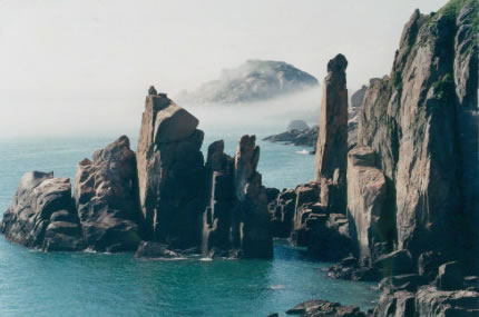 慈航普渡的觀世音菩薩在南麂列島定格、凝固成了高20米的天然巨像,它身披風(fēng)帔(俗稱“觀音兜”),垂著兩袖,眉目宛然,專注地向東海第面凝視。然而這觀音巖腳下全是刀劍般的礁石,潮來(lái)時(shí)淹滿水,更像是泥犁地獄了。而在不遠(yuǎn)的1.5米外,有5支石柱聳立,其中最高的柱頂,酷似調(diào)皮搗亂和小猴子。它在觀音菩薩面前,有所窺伺,又有所祈求。更令人驚奇的是,景隨步移,若南行數(shù)十步,從另一個(gè)角度望,慈目的妙齡觀音卻突然變成了老態(tài)龍鐘的南極仙翁,故人們又稱之“壽星巖”。移步換形不僅平尜游人興趣,而且從“雙面人”身上也不有同感悟。