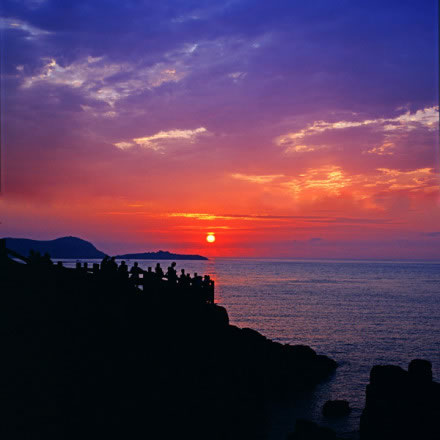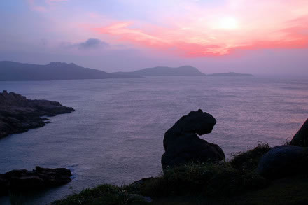 南麂島有兩座山,一座叫南麂山,高192米,另一座叫大山,高229米。這兩山蟠踞在一起,東南面形成了大沙岙,西北面形成了馬祖岙,站在山巔可望東海萬(wàn)頃云濤。尤其是看日出,一輪紅日,躍出在海平線上;紅日西沉,則滿天彩霞,逐步消失于蒼茫的暮色之中。