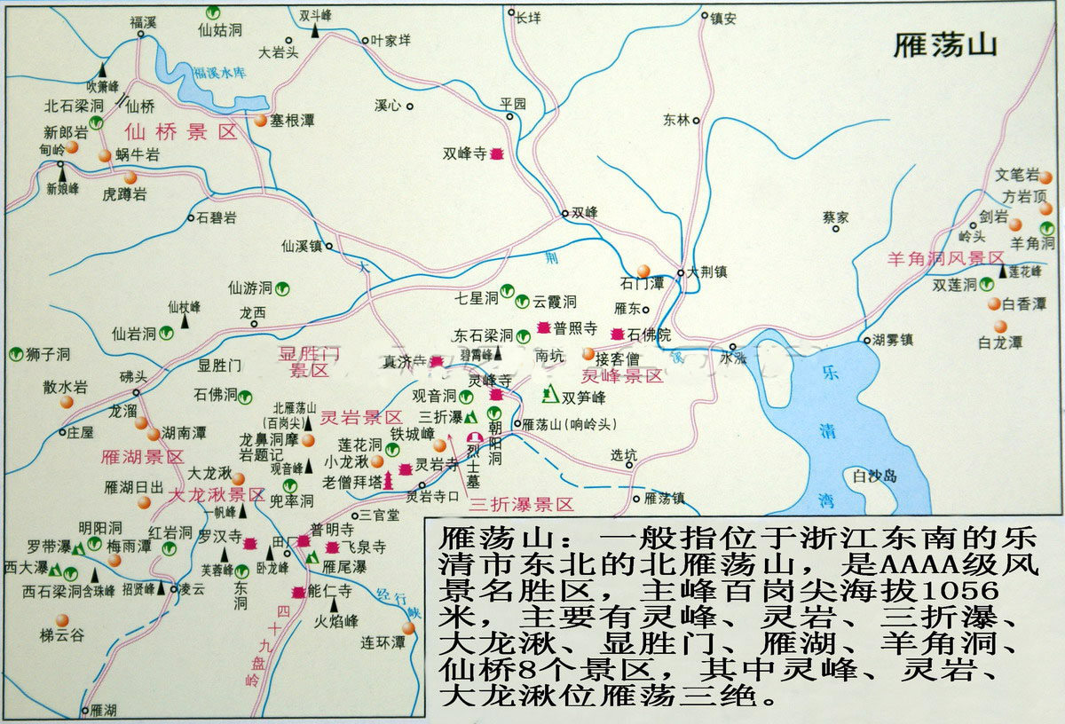 北雁蕩山位于樂清市境內(nèi)東北部,萬山重疊,群峰爭(zhēng)雄,懸嶂蔽日,飛瀑凌空,古木參天,自古就有“寰中絕勝”之譽(yù),是全國(guó)十大名山之一。北雁蕩山有102峰、64巖、26石、46洞、14嶂、18瀑、28潭、13坑、13嶺、10泉、2水、8門、4闕、7溪1澗、8橋2湖、5尖2峽等,由此將其分為靈峰、靈巖、大龍湫、顯圣門、雁湖5個(gè)景區(qū)。