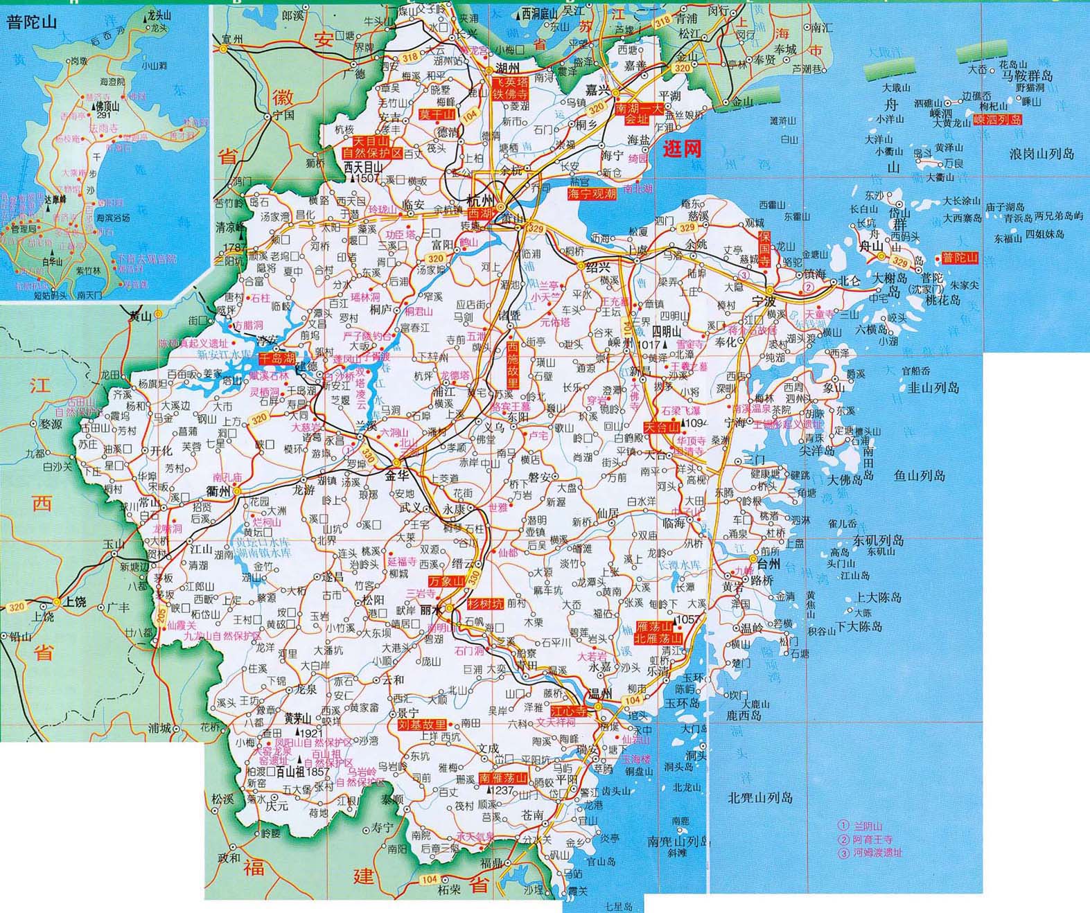 浙江是中國著名的旅游勝地,旅游景點眾多,類型豐富,有重要地貌景觀800余處,水域景觀200余處,生物景觀100余處,人文景觀100余處。全省現(xiàn)有西湖、兩江一湖(富春江-新安江-千島湖)、雁蕩山、楠溪江、普陀山、嵊泗列島、天臺山、莫干山、雪竇山等14個國家級風景名勝區(qū),居中國首位。此外還有省級風景名勝區(qū)42個,杭州之江國家旅游度假區(qū)和蕭山湘湖、溫州甌江、紹興會稽山等省級旅游度假區(qū)13個。省會杭州是中國七大古都之一,也是中國著名的風景旅游城市,以秀麗迷人的西湖自然風光聞名于世。